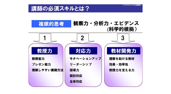 「教え方」は経験だけで身につくものではありません。体系化したセオリーを基にした経験が大切です。「インストラクションスキル」はエビデンスに基づいたスキルですので、学ぶことで、経験に関わらず、誰もが実践することができます。経験だけで身につけるには、少なくとも3年以上はかかる内容が盛り込まれています。